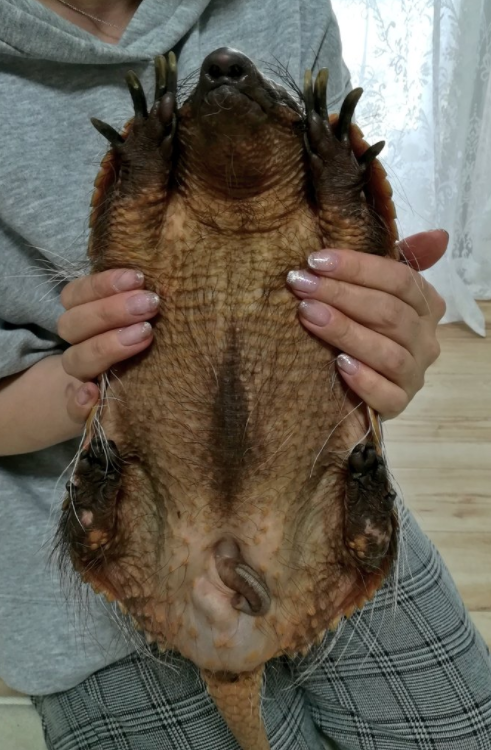 アルじろーくんはムツオビアルマジロという種類の、まだ子供(成長途中)とのことで、現在はチワワくらいのサイズに猫くらいの体重です。抱っこされているのは飼い主様です。抱っこにはコツがいるらしく、私には難しかった。少し下の方をつかんでしまうと後ろ足をジタバタさせるので、もし爪が当たると危ないとの事。そして結構な素早さで移動するので、捕まえるのも大変です(笑)私が打ち合わせに来た初対面の時には人見知りしたらしく、ソファの下に隠れてしまったり、フゥフゥと興奮したりなされていました☻